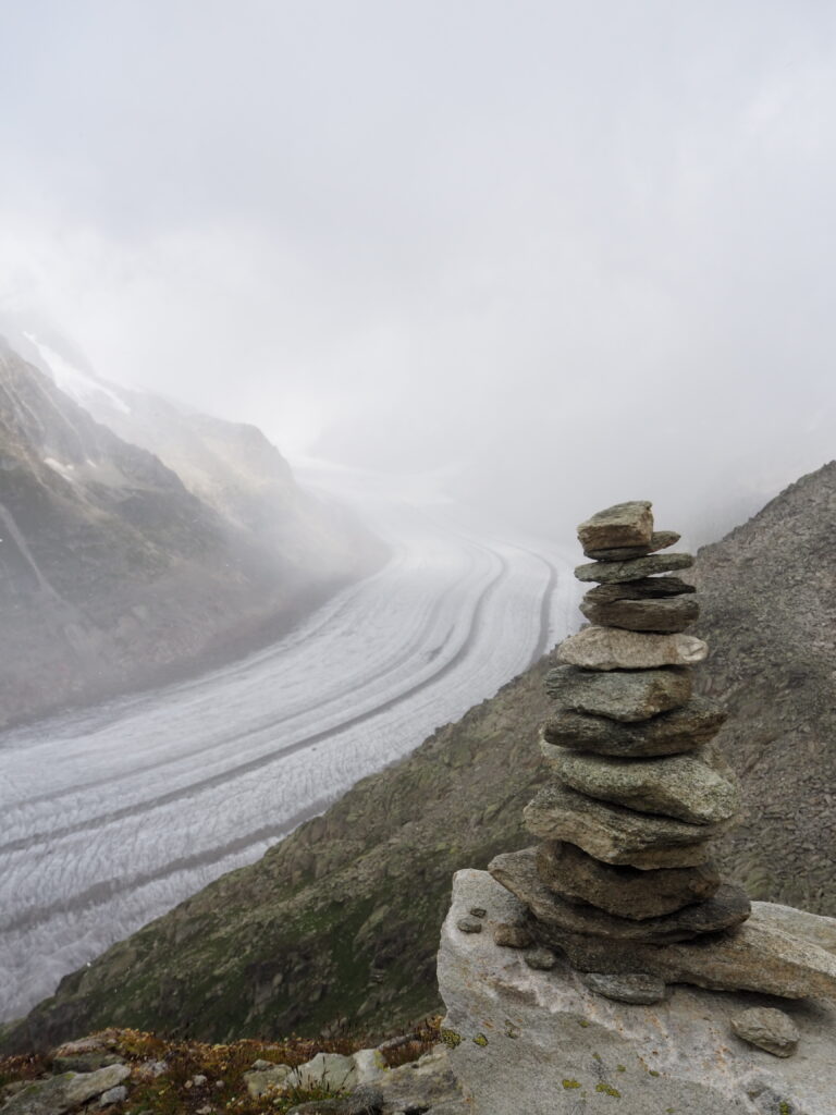 Nach der Moosfluh fuhren wir weiter nach Fiesch und von dort mit der Gondel auf das Eggishorn. Oben pfiff uns der Wind um die Ohren, aber die Ausblicke auf den Aletschgletscher entschädigten jede Anstrengung. Für Wanderer gibt es die Möglichkeit, noch weiter nach oben zu steigen und das Eggishorn zu erklimmen – ein Abenteuer für geübte Bergsteiger. Trotz Wolken war der Gletscher atemberaubend, nur die Sicht auf Eiger, Mönch und Jungfrau blieb uns verwehrt.