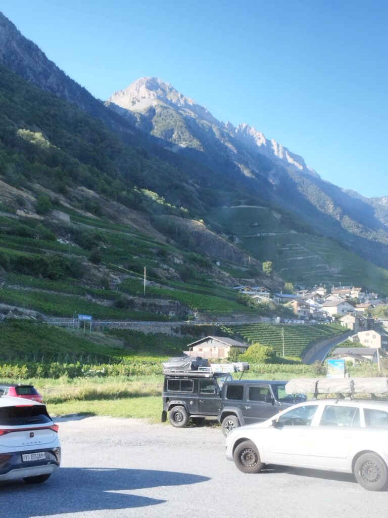 Nach diesem eindrucksvollen Stopp fuhren wir weiter zu unserem Stellplatz für die Nacht. Dank Swiss Terroir durften wir unser Camper-Bett in Fully aufschlagen – mitten in den Weinbergen, direkt neben einer kleinen Bar. Mit einem Drink in der Hand und Blick auf die Reben ließen wir den Abend entspannt ausklingen.